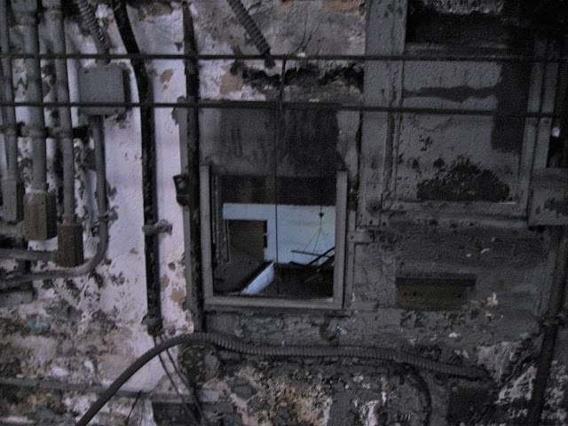 The Hamilton stopped showing movies in 1965. After that it became a sports arena (what sports I do not know but probably boxing), a church and a disco. The theater's last use was as a beer and soda (maybe cigarettes as well) wholesaler. In the previous picture you can see a ramp going up the to the stage. This was installed to accommodate a fork lift. A doorway with a metal role gate was cut into the asbestos fire curtain.